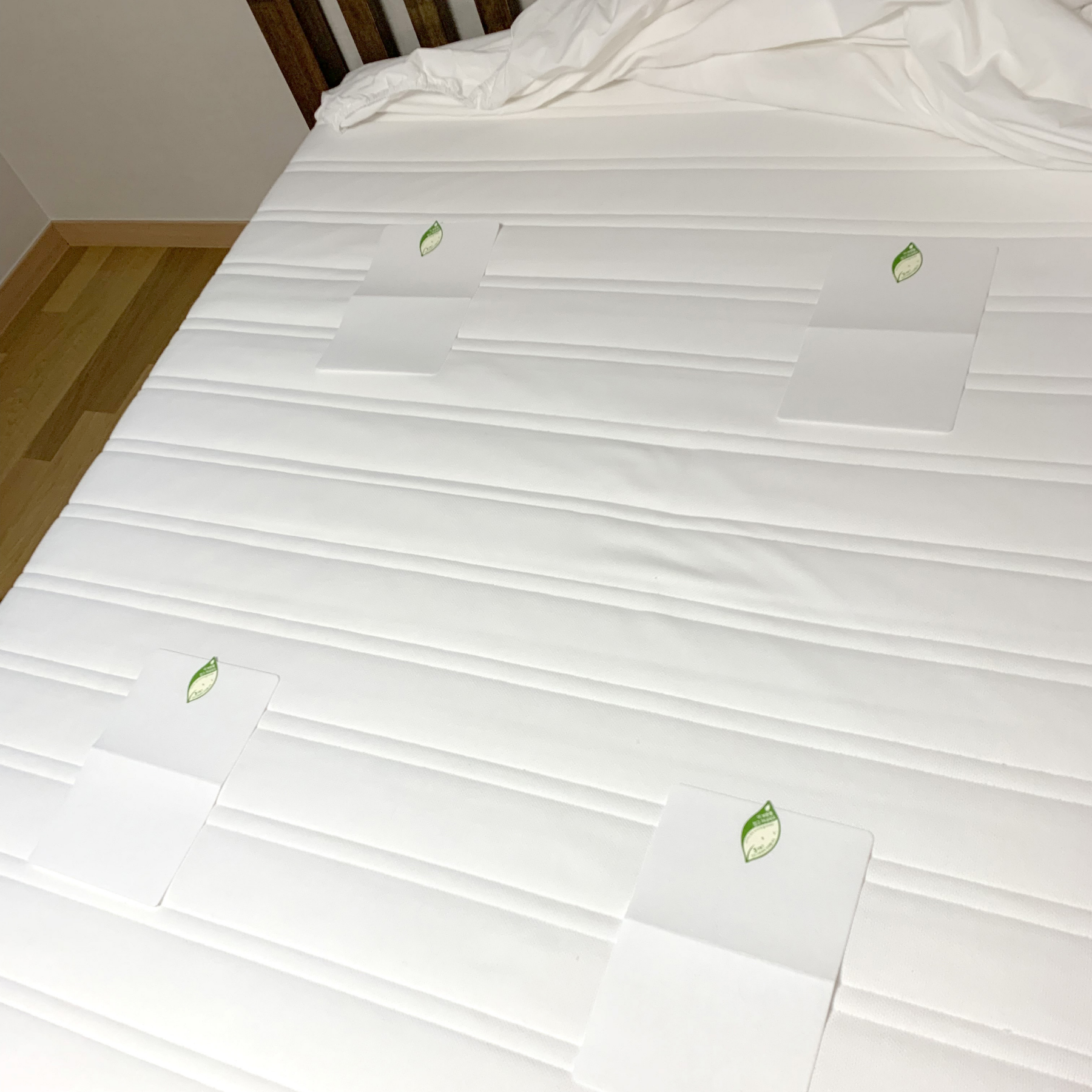 진드기싹 시트타입은 90일간 효과가 지속되는데요. 침대 매트리스 위에 4개를 적당한 간격으로 올려두고 시트를 씌워 주면 끝입니다.